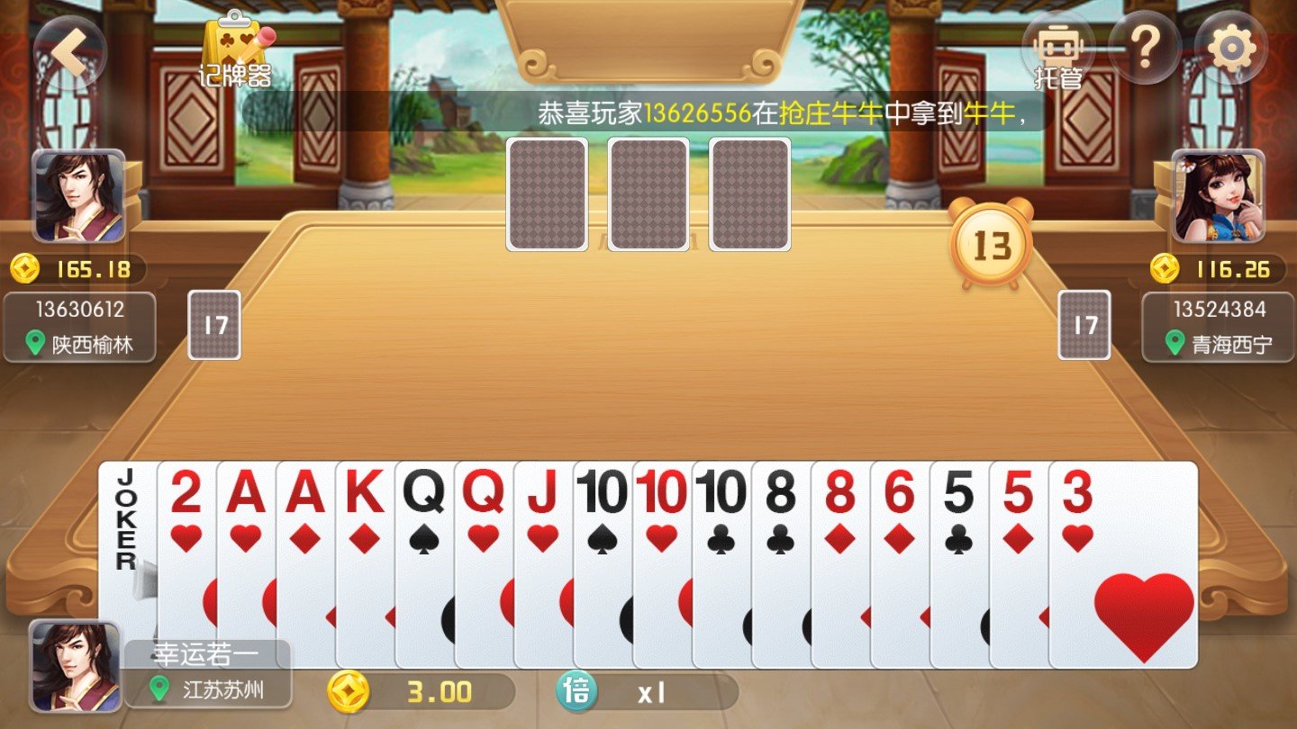 2)游戏牌数:54张,加大小王,一人17张,三张作为底牌,地主为确定的时候不能看底牌。