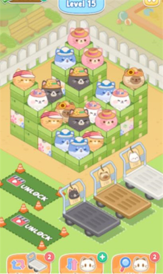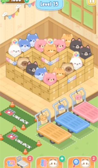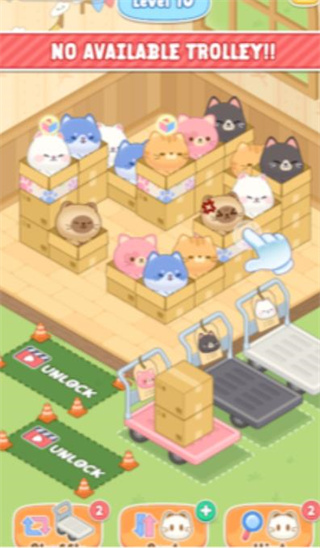 1、通过点点点的方式,将三只相同颜色的小猫放在小推车上就可以消除了。